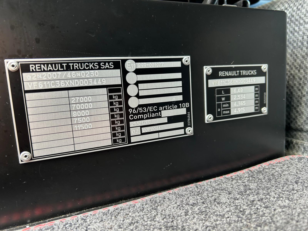 Tillbehör | Renault T-Range T480 6x2P dragbil. Årsmodell 2022. 407 000 km. Hjulbas 4 100 mm. DTI 13 Euro 6 på 480 hk. Optidriver AT2612F automat. Optibrake+. Parabel fram, luft bak. Bränsletank 550 l, AdBlue 44 l. JOST luftförskjutbar vändskiva, skammelhöjd 1 170 mm. ACC/FCW, körfältsassistans, lastindikator, navigation, bluetooth, kylskåp, multifunktionsratt, thermo/laminerade sidorutor. Förarstol med värme/ventilation. Spoilersats, extraarbetsljus och extraprojektorer, växellådskylare, verktygslåda. Färg: Blå (RAL 5022). Lastbilen levereras nybesiktigad och registrerad i Sverige. Se fler bilder på vår hemsida www.scanvo.se eller ring oss på Scanvo Lastbil AB så berättar vi mer. Tel. 0340-84 000 |