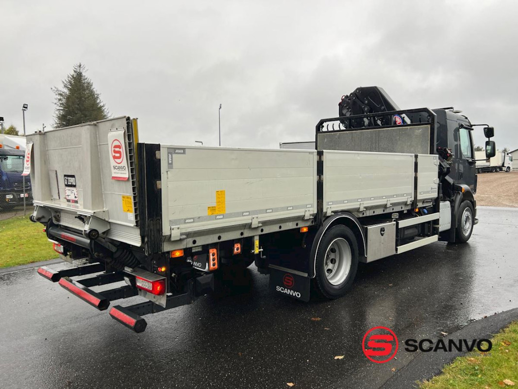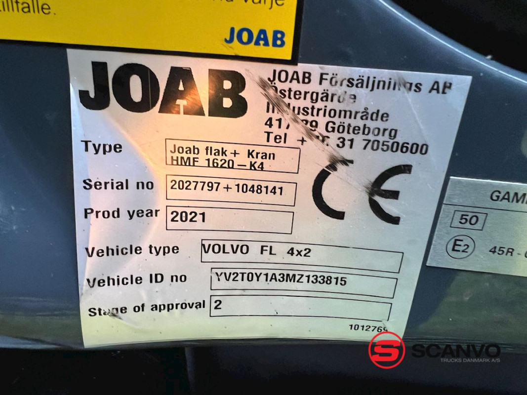 | Tillbehör | Volvo FL 280 med frontmonterad HMF 1620-RCS K6-kran från 2021 med 6 hydrauliska utskjut och upp till 17,2 meters räckvidd. Fast flak från JOAB med 5 500 mm invändig längd, 700 mm alu-sidor och stålig/träbotten. Utrustad med radiostyrning, wire-spel, backkamera, LED-belysning under flaket samt verktygslåda. Kan lasta 18 Europallar. Levereras nybesiktigad och registrerad i Sverige. Se fler bilder på vår hemsida www.scanvo.se eller ring oss på Scanvo Lastbil AB så berättar vi mer! 0340-84 000 |