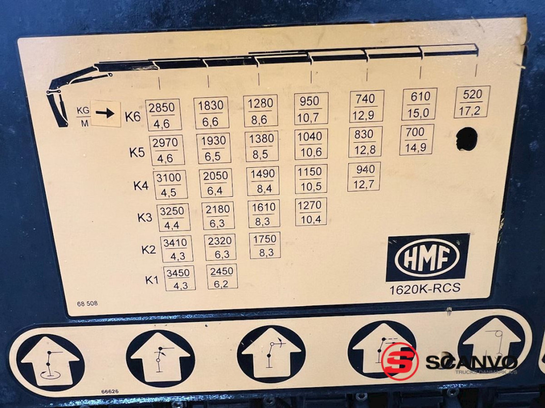 | Kran | HMF 1620 RCS K6 (6 utskjut, räckvidd 17,2 m, 520 kg vid max, 950 kg vid 10,7 m) |